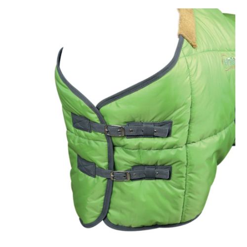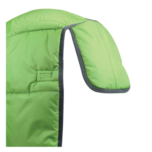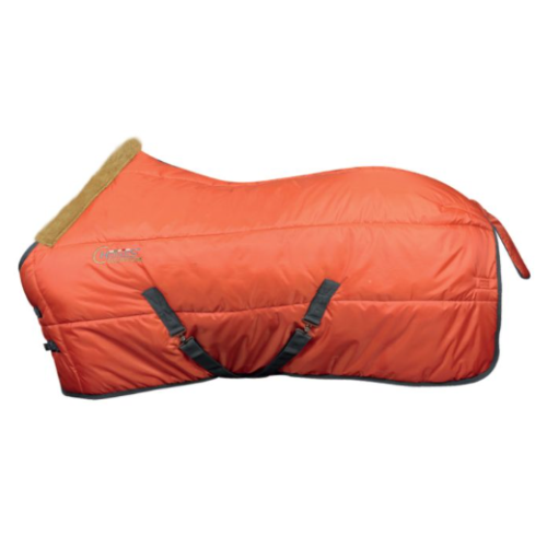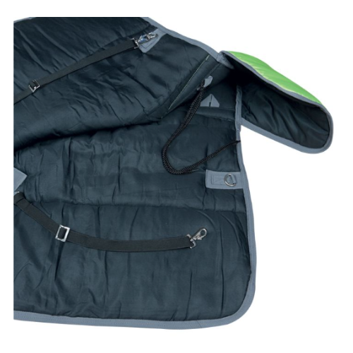 Équipée de sangles croisées, de sangles sous les jambes, d'un couvre-queue, d'une double fermeture frontale et d'un insert en fourrure plus long que les couvertures classiques pour protéger davantage le cheval des frottements et des écailles.